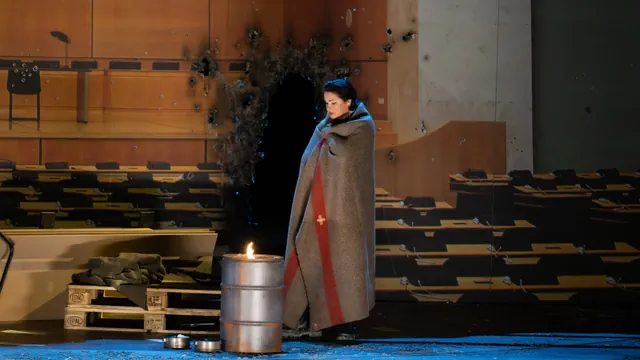 Das Opernhaus hält an der Besetzung fest und trägt mit der Inszenierung von Giuseppe Verdis Oper «La Forza del Destino» zu einem kontroversen Abend bei. Schon während der Ouvertüre macht eine Projektion klar: Die Schweiz ist im Krieg. Der Feind kommt von Osten, hat zuerst St. Gallen und dann Winterthur eingenommen. Zürich ist vom Krieg schwer gezeichnet.