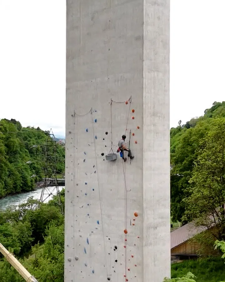 16 Kletterrouten, über 1800 Haltegriffe, die obersten auf 45 Metern Höhe: Der neue Freiluft-Kletterspot an zwei Hauptpfeilern des Felsenauviadukts der Autobahn A1 bei Bern hat es in sich.