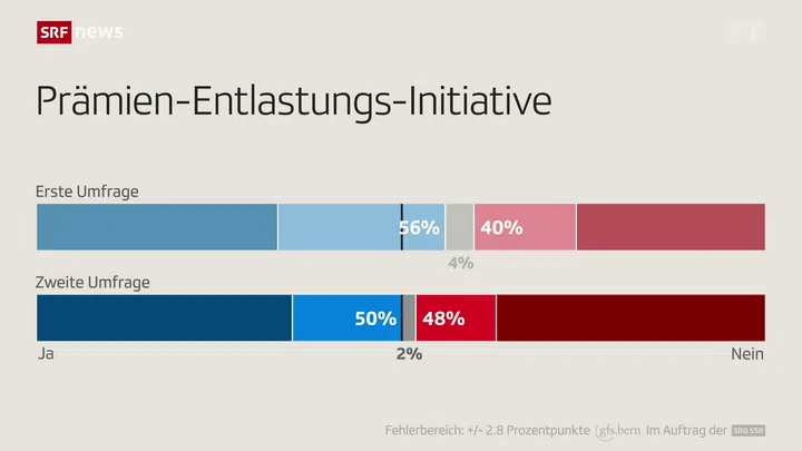 Der Abstimmungskampf ist in voller Fahrt – bei der Prämien-Entlastungs-Initiative kommt es trotz Vorsprung der Befürworterinnen und Befürworter zu einer steigenden Ablehnung. 48 Prozent der befragten Stimmberechtigten wollten eher oder bestimmt dagegen stimmen. Unter Berücksichtigung des Stichprobenfehlers ergibt das drei Wochen vor der Abstimmung praktisch ein Unentschieden.