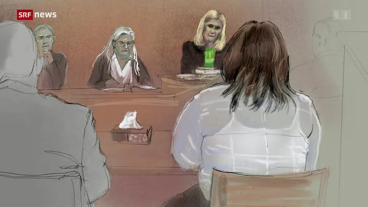Bild 2 von 2. Zeichnung der Situation im Gerichtssaal in Bremgarten (v. l. n. r.): Verteidiger des Vaters, der Kindsvater, Verteidiger der Grossmutter, die Grossmutter. Diese sagte vor Gericht, sie habe von der Tat erfahren. Die Staatsanwaltschaft sagt, die Grossmutter sei von Anfang an informiert gewesen. Bildquelle: SRF/ERIKA BARDAKCI-EGLI.
