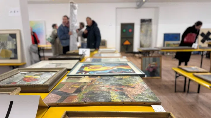 Damit der Räumungsverkauf geordnet ablaufen kann, dürfen nur 40 Personen aufs Mal in die Halle. Die anderen warten draussen. Drinnen sind auf langen Reihen von Klapptischen die Werke alphabetisch nach Künstlerin und Künstler sortiert.