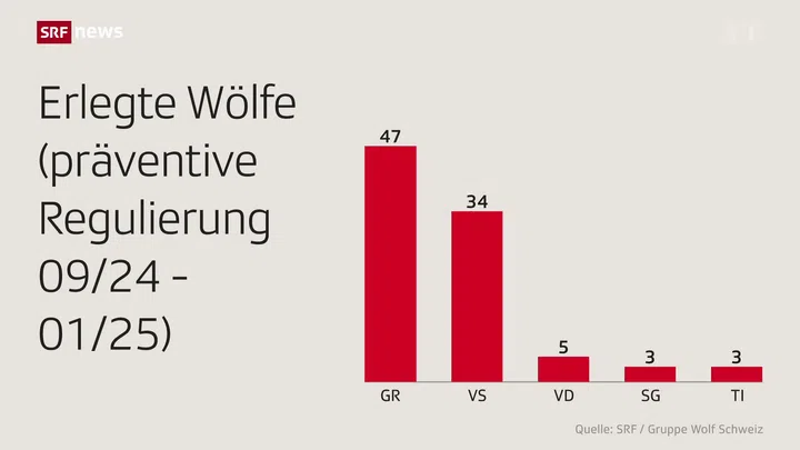 Am meisten abgeschossen hat der Kanton Graubünden. Insgesamt 48 waren das. Wobei darin wohl der Abschuss eines schadenstiftenden Einzelwolfes enthalten ist, wie Recherchen von SRF in Zusammenarbeit mit der Gruppe Wolf Schweiz zeigen. Deshalb ist dieses Tier in den abgebildeten Grafiken herausgerechnet.