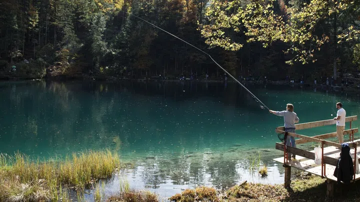 Der Blausee mit seinem glasklaren, smaragdgrünen Wasser ist für viele Menschen ein Juwel im Kandertal im Berner Oberland – und ein beliebter Ort, um frische Regenbogenforellen zu kaufen.