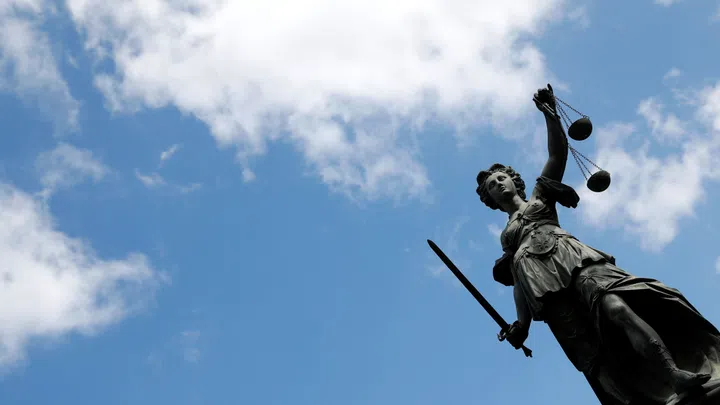 Eine Justitia aus Bronze hält eine Waage, dahinter leicht bewölkter Himmel.