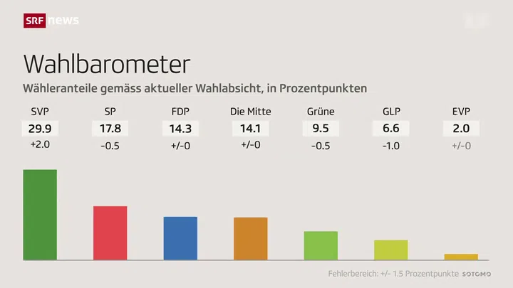 SVP gewinnt, Mitte-Links verliert: Die SVP ist die einzige Partei, die laut dem neusten Wahlbarometer von Sotomo zulegt. Sie gewinnt 2 Prozentpunkte. Keine Partei verliert deutlich, aber die Parteien des Mitte-Links-Spektrums verlieren insgesamt an Unterstützung.