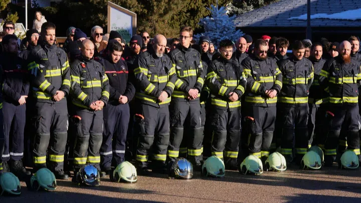 Bild 4 von 35. Gedenkmesse für die Opfer der Brandkatastrophe: Feuerwehrleute stehen während der Messe vor der Chapelle Saint-Christophe de Crans zu Ehren der Opfer. Bildquelle: REUTERS/Lisa Leutner.