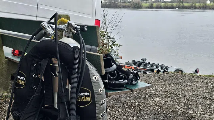 Bild 2 von 3. Die Tauchfachleute der Polizei Basel-Landschaft waren am Montag im Rhein bei Wallbach unterwegs. Bildquelle: SRF / BRK News.