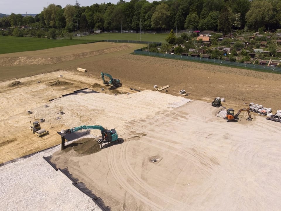Bild 6 von 7. Noch immer sind Baumaschinen im Einsatz und bereiten das Gelände für den Ausbau des Containerdorfes vor. Bildquelle: Keystone.
