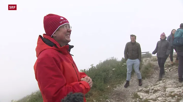 Rösti schreitet den steinigen Weg zum Gipfel hinauf, während er über die Herausforderungen in seinem Departement für Umwelt, Verkehr, Energie und Kommunikation spricht. Er zeigt sich dabei in vielem betont optimistisch, als wollte er einen Kontrapunkt zum garstigen Wetter setzen.
