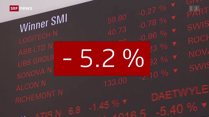 - Der Leitindex SMI schloss 5.2 Prozent im Minus (11'047 Punkte) gegenüber dem Kurs von Freitag.
