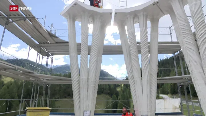 Gewundene Säulen bilden die Tragstruktur des filigranen Gebäudes. Diese Elemente werden an der ETH gedruckt, in Savognin GR zusammengeschraubt und dann nach Mulegns gebracht.