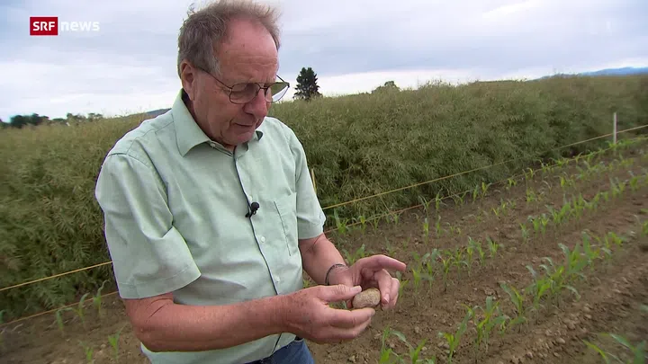 Meist dauert es nur ein paar Minuten, bis Brogli auf dem Feld einen Stein findet. Mehrheitlich sind es Funde aus der Steinzeit, Tausende bis Zehntausende Jahre alt. Fast täglich ist Werner Brogli auf dem Möhliner Feld unterwegs, auch beim Besuch von SRF. «Hier liegt etwas. Ein Klopf- oder Schlagstein. Mich fasziniert das immer, weil ich weiss, dass jemand jahrelang damit gearbeitet hat.»