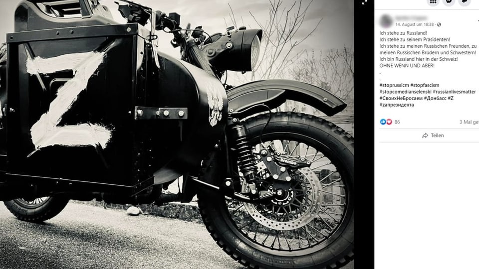Der Chef der Schweizer «Nachtwölfe» schreibt auf Facebook: «Ich stehe zu Russland! Ich stehe zu seinem Präsidenten!» Daneben das Bild eines Motorrads mit einem «Z» darauf.