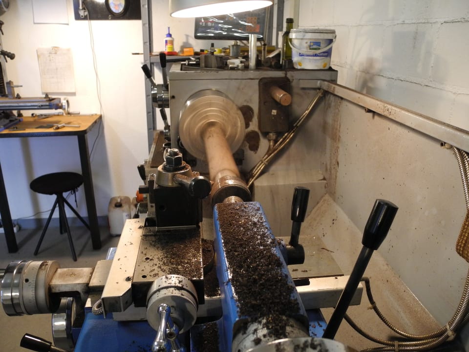 Bild 6 von 9. Die Drechselmaschine am Laufen. Wenn das Grenadill-Holz frisch ist, riecht es bei diesem Arbeitsschritt nach Schokoloade. Bildquelle: Roman Portmann/SRF.