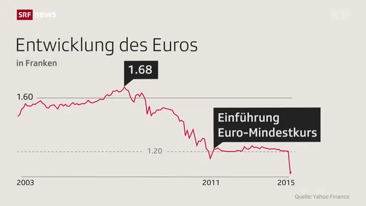 Die Reaktion der Aktienmärkte: Der Schweizer Aktienindex SMI stürzte zeitweise um mehr als 13 Prozent ab. Nach einer leichten Erholung schloss er an jenem Tag mit -8.7 Prozent. Auch der Euro und der US-Dollar gaben deutlich nach: Der Euro fiel um knapp 18 Rappen auf 1.02 Franken, der Dollar um knapp 14 Rappen auf 0.88 Franken.