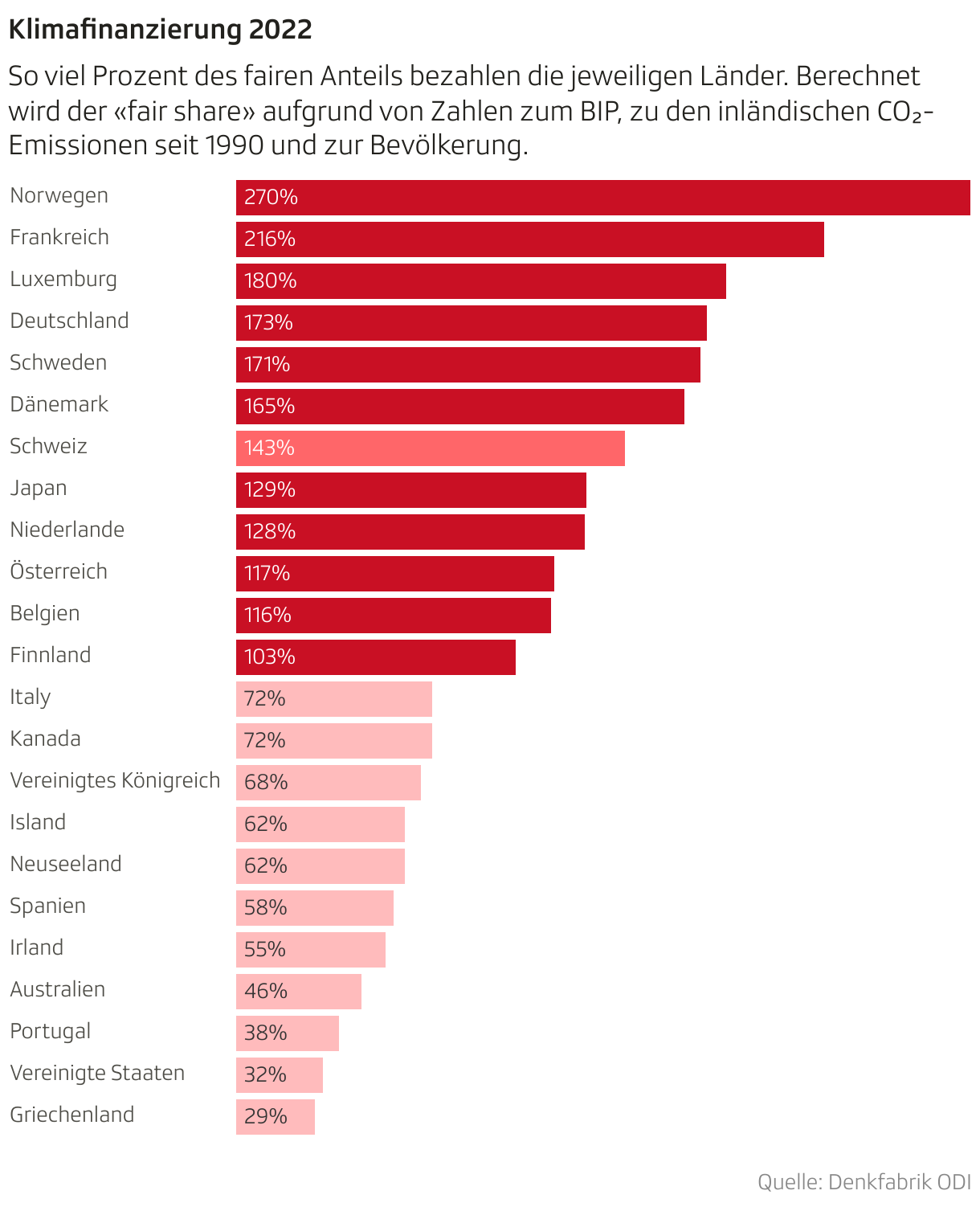 Der bisherige Beitrag der Schweiz: Je nach Berechnungsart hat die Schweiz im Jahr 2022 zwischen 600 Millionen (Bund) und 1.1 Milliarden (ODI) Franken an Klimageldern bezahlt. Der Bundesrat ist überzeugt, damit seine Verantwortung wahrzunehmen. Die Denkfabrik ODI bescheinigt der Schweiz gar, deutlich mehr zu zahlen als sie müsste. Klimaschutzorganisationen wiederum kritisieren den Schweizer Beitrag als ungenügend, weil bei der Berechnung die Emissionen der Schweiz im Ausland nicht berücksichtigt werden. Im internationalen Vergleich schneidet die Schweiz allerdings aktuell relativ gut ab.