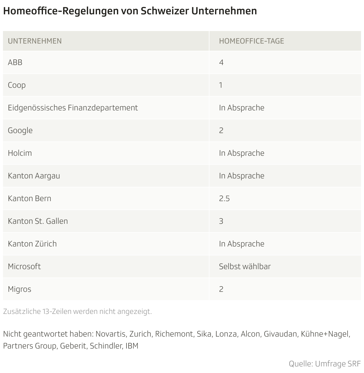 Unter den befragten Unternehmen ist auch eine Reihe, die keine Homeoffice-Regel hat. Sprich: Es ist Sache des Teams und der Vorgesetzten. Holcim, das Eidgenössische Finanzdepartement, die SRG, Swiss Life, Swiss Re oder die Schweizerische Post gehören dazu. Über solche Unternehmen sagt Christian Fichter: «Sie haben entweder ein Produkt oder eine Dienstleistung, die sich von alleine verkaufen. Oder es ist eine Firma, die sehr grosses Vertrauen in ihre Mitarbeitenden hat – und Mitarbeitende, die dieses Vertrauen auch verdienen und damit umgehen können.»