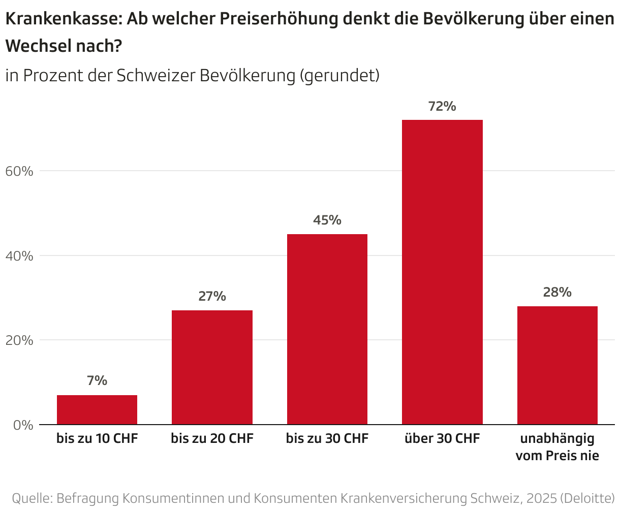 Je stärker der Trend zum Wunsch nach einem langen Leben in der breiten Bevölkerung ankommt, desto mehr werden auch Krankenkassen unter Druck kommen, sich an den Kosten der entsprechenden Therapien zu beteiligen. Billiger werden Krankenkassenprämien dadurch sicher nicht. Allerdings: Die Deloitte-Studie zeigt auch, dass immer mehr Schweizer und Schweizerinnen im Herbst Prämien vergleichen und bereit sind, die Grundversicherung zu wechseln. 12 Prozent waren es anfangs 2025, was zum dritten Mal in Folge über dem langjährigen Schnitt ist. Der Prämienanstieg ist für den Wechsel der Grundversicherung der Hauptgrund.