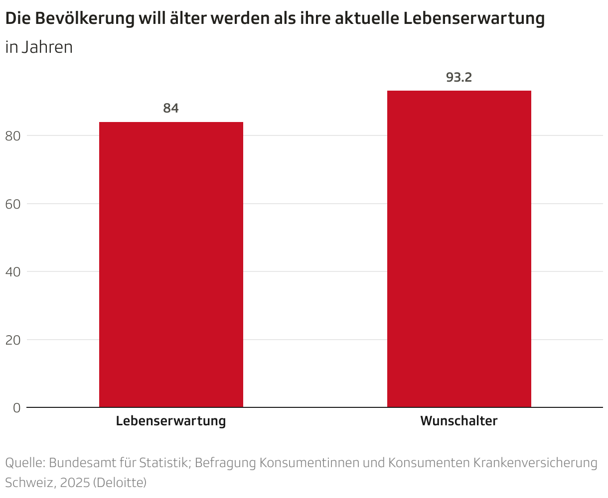Das Beratungsunternehmen Deloitte befragt die Schweizer Bevölkerung regelmässig zu ihrem Verhältnis zu den Krankenkassen. Die gestellten Fragen sind aber nicht immer dieselben: So hat Deloitte in der jüngsten Befragung danach gefragt, wie alt die Leute werden möchten. Die Antwort überrascht selbst den Studienleiter Marcel Thom: «Mit einem durchschnittlichen Wunschalter von rund 93 haben wir nicht gerechnet. Das ist schon sehr hoch.» Zumal die Lebenserwartung laut dem Bundesamt für Statistik im Schnitt bei 84 Jahren liegt.