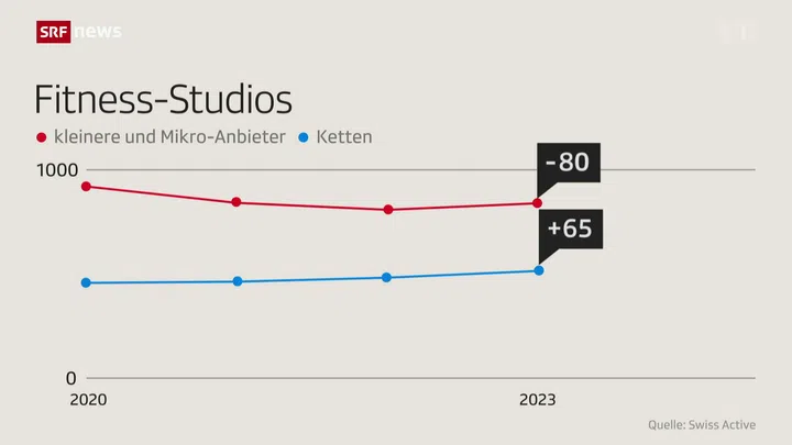 Die durchschnittliche Fitnesskundin ist 40 Jahre alt und 1.3-mal pro Woche im Studio anzutreffen. Immer häufiger allerdings in einem von grossen Fitnessketten. Denn die Grossen verdrängen die Kleinen vom Markt. Zwar gehört die Mehrheit von den gut 1300 Fitnesscentern in der Schweiz noch zu Einzel- und Mikrobetrieben mit maximal vier Standorten. Doch die grossen Player holen auf: Seit der Pandemie sind knapp 80 kleinere Betriebe verschwunden, während die grossen Ketten 65 Studios eröffnet oder übernommen haben.