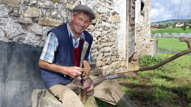 Der 87-jährige Bauer Emil Dubacher bewirtschaftet den Hof Eltbühl in Weggis. Sein Leben lang hat er mit der Sense das Gras gemäht. Und diese Sense will natürlich geschärft sein. Das Verfahren heisst dengeln - auf Mundart «dängele».