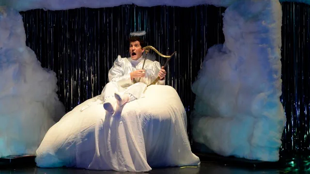 Im Bernhardtheater ist der liebe Gott eine Göttin. Eine sehr bekannte Göttin. Birgitt Steinegger, bekannt aus Radio und Fernsehen, thront hoch über der Bühne in einer Wolke und erteilt Befehle. Ausgerechnet Hugo, der Unschuldsengel, soll auf die Erde fliegen. Genauer gesagt nach Zürich, weil es im Sündenpfuhl an der Limmat anscheinend allzu sündig zu und her geht.