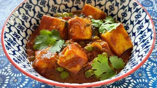 Matar Paneer aus dem Süden Indiens wird mit Frischkäse zubereitet und kurz geschmort.
