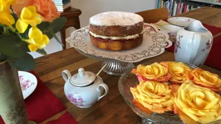 Der britische Kuchen hat zwei Böden, dazwischen liegt eine Buttercrème und eine feine Erdbeerkonfitüre.