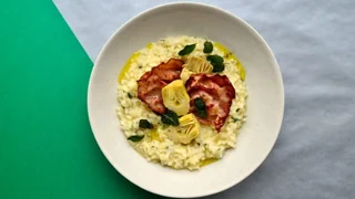 Dieses Risotto mit Artischocken, knusprigem Bauernschinken und Salbei bringt mediterranes Flair auf den Teller.