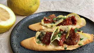 Knusprige Bruschette mit fein gehobelter Zitronatzitrone, getrockneten Tomaten, Kapern und Oliven. Sonne auf dem Teller!