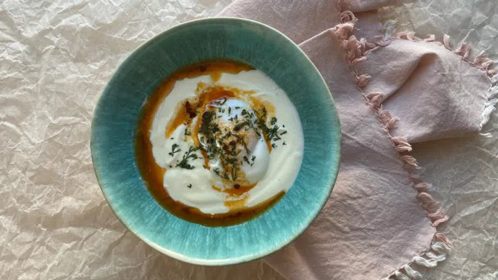 - Die Eier dann aus dem Wasser heben und aufs Joghurt geben.