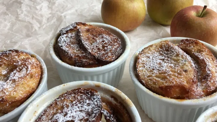 - Die «Bödeli» der Schälchen mit einem Teil der eingeweichten Brotscheiben belegen. Die Apfelstücke auf die Schälchen verteilen und mit den restlichen Brotscheiben belegen. Mit einer Gabel gut andrücken und die restliche Milch-Vanille-Eier-Mischung auf die Schälchen verteilen.