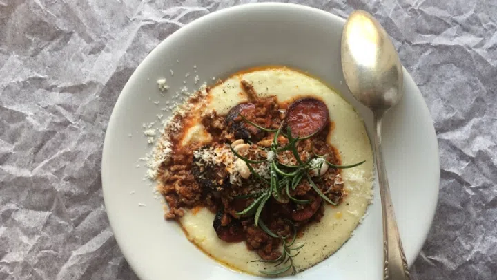 Rezept für Hackfleisch mit Chorizo und Cannellini-Bohnen auf Griessbrei