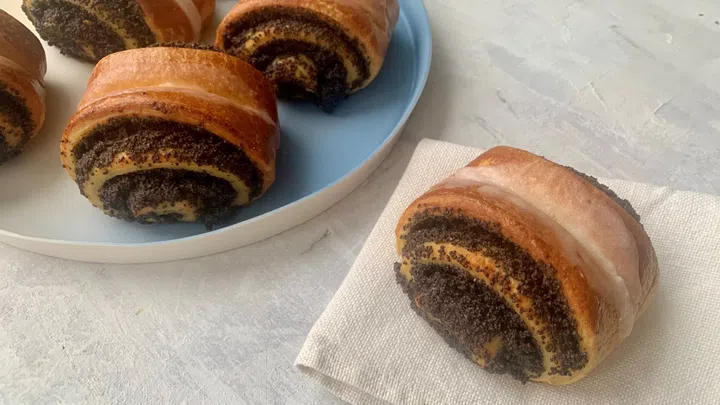 Zuerst werden ein Milchteig und die Mohnfüllung erstellt, dann die Schnecken geformt und gebacken.