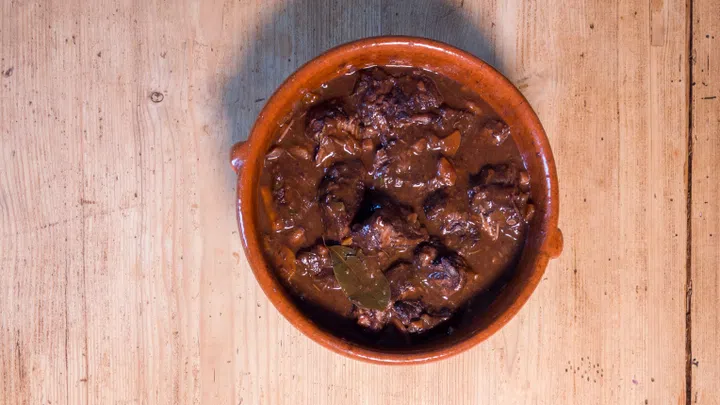 - Die Hitze reduzieren und bei tiefer bis mittlerer Temperatur mit geschlossenem Deckel ca. 2 Stunden schmoren und immer wieder umrühren. Danach den Deckel entfernen und die Flüssigkeit reduzieren, bis die Sauce etwas eindickt. Vor dem servieren geschnittener glatter Peterli untermengen.