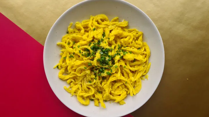- Butter in einer Bratpfanne erhitzen. Spätzli darin heiss werden lassen. Schnittlauch in feine Ringe schneiden. Spätzli mit Schnittlauch bestreuen und servieren.
