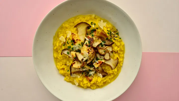 - Parmesan reiben und mit der Butter zum Risotto rühren.