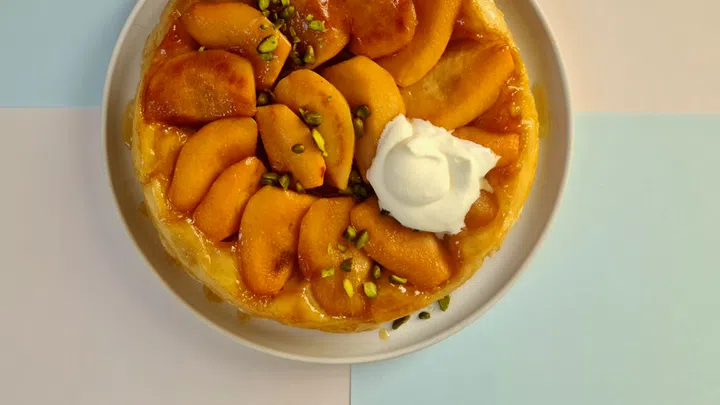 - Quitten-Tarte-Tatin vorsichtig auf einen grossen Teller stürzen. Lauwarm mit Rahm servieren. Nach Belieben mit gehackten Pistazien bestreuen.