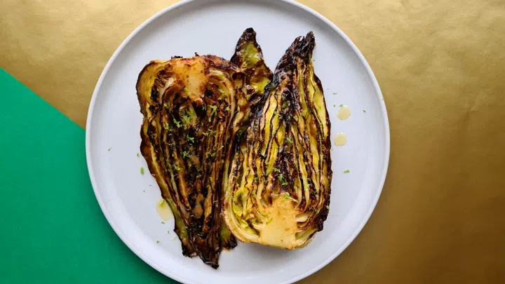- Backofen auf 200 °C Umluft vorheizen. Spitzkohl längs halbieren. Öl in einer grossen Bratpfanne erhitzen. Spitzkohl auf der Schnittfläche goldbraun anbraten. Auf ein mit Backpapier belegtes Blech legen. In der Ofenmitte ca. 30 Minuten backen.