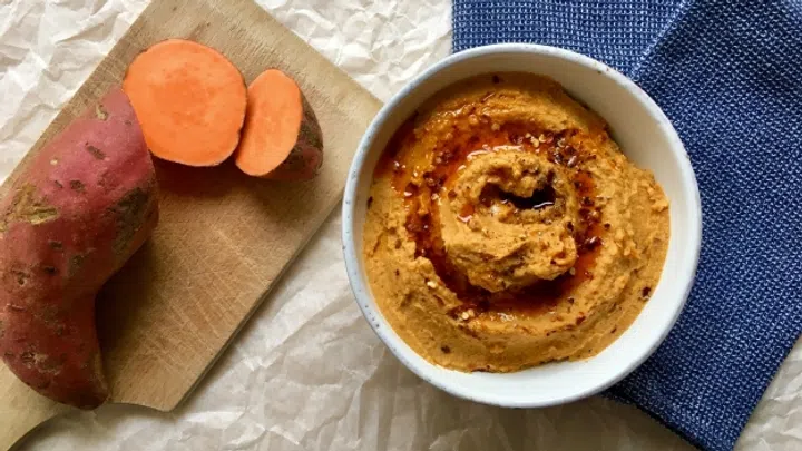 - Die abgetropften Kichererbsen und die Süsskartoffelstücke zusammen mit dem Tahini, dem Kreuzkümmel, dem Paprika- und dem Chilipulver, dem Knoblauch und dem Zitronensaft in den Cutter geben. Mit Salz und Pfeffer aus der Mühle würzen und einen EL Olivenöl und wenig Wasser dazugeben. Ganz fein cuttern und dabei esslöffelweise etwas Wasser zugeben, bis der Hummus die richtige Konsistenz hat.