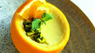 Passend zur Saison: Frische Orangen, gefüllt mit einer Crème aus Rahm, Joghurt, Orangensaft, Zesten, Zucker und Vanille.