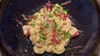 Ein herrliches Gericht, Tortellini an einer cremigen Gorgonzola-Sauce mit geschmorten Zwiebeln.