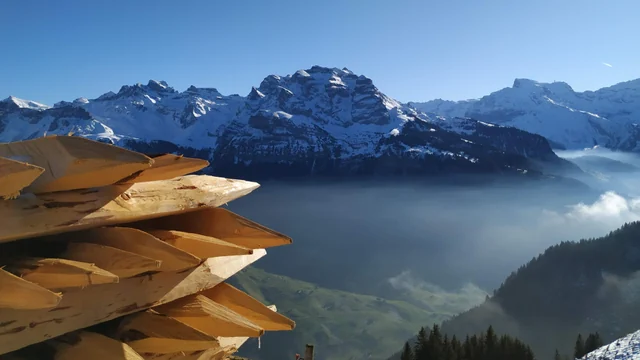 Bild 7 von 7. An schönen Novembertagen steigen die Nebelschwaden langsam aus dem Engelbergertal hinauf und geben den Blick frei auf das eindrucksvolle Panorama mit der Titliskette. Bildquelle: SRF/Marcel Hähni.