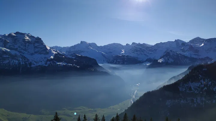 Bild 7 von 7. An schönen Novembertagen steigen die Nebelschwaden langsam aus dem Engelbergertal hinauf und geben den Blick frei auf das eindrucksvolle Panorama mit der Titliskette. Bildquelle: SRF/Marcel Hähni.