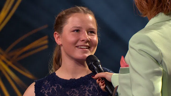 An den «Sports Awards» überreicht Fabienne Gyr der stolzen Siegerin neben dem Titel «SRF 3 Best Talent Sport» 2023 den Nachwuchsförderpreis der Schweizer Sporthilfe im Wert von 12'000 Franken.