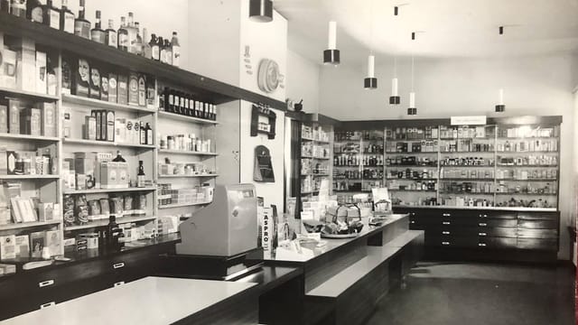 Bild 6 von 7. Die Apotheke in Bütschwil . Hier sorgten Annelies und ihr Ehemann Gebhard Eichmann während 18 Jahren für Linderung bei grossen und kleinen Beschwerden. Auch für das Veh boten sie Hilfe an. Bildquelle: SRF.