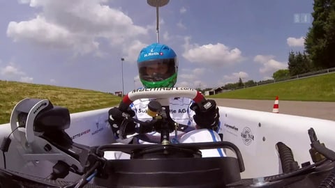 Schauspieler Beat Schlatter, Moderatorin Annina Frey und Komiker Charles Nguela fahren um den Sieg.