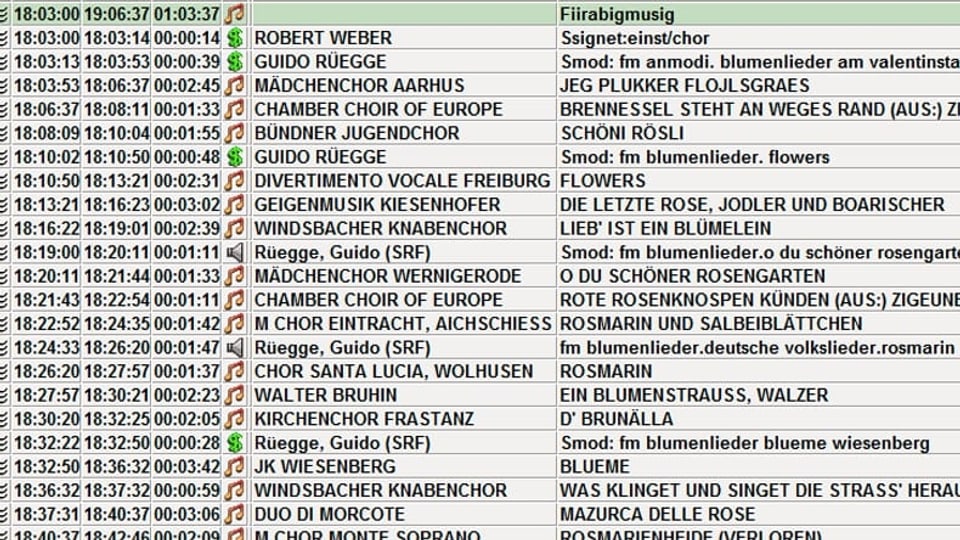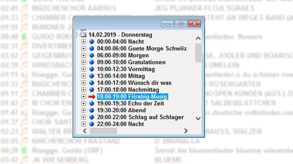 Bild 1 von 9. Im Planungsprogramm MusicMaster prüft und korrigiert Guido Rüegge die gemäss vordefinierter Vorgaben automatisch erstellten Musikvorschläge. Zu den wichtigsten Informationen gehören neben Titel und Interpret die Farbcodes der Musikkategorien sowie die Zahlenkombinationen für Tempo und Stimmung. Bildquelle: SRF.
