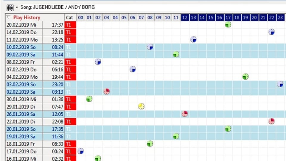 Bild 2 von 9. Wann lief beispielsweise «Jugendliebe» von Andy Borg in den vergangenen Tagen im Programm? Diese Übersicht zeigt es. Ziel ist, dass ein Stück möglichst nicht immer zur gleichen Tageszeit im Programm zu hören ist. Bildquelle: SRF.