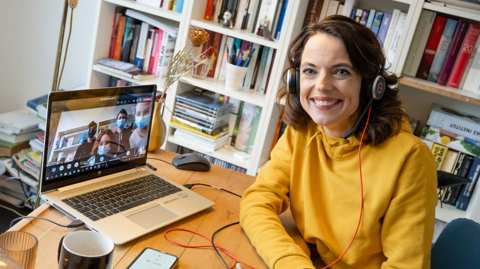 Bild 1 von 5. Von zu Hause aus beantwortet Mona Vetsch Fragen der Sekundarklasse 2Tb aus Pratteln. Bildquelle: SRF / Oscar Alessio.